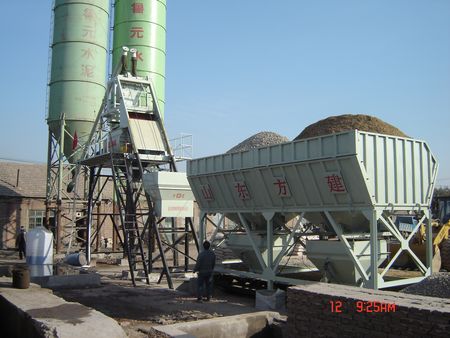HZS75型混凝土搅拌站是由供料、配料、搅拌、电气控制及钢结构部件组成的全自动混凝土拌制成套设备,适用于中等以上规模的建筑工地、预制件厂和商品混凝土生产厂。 该站骨料配料部分,采用PL2400型混凝土配料机,装载机上料,气动扇型门给料,电子秤计量,可同时储存三种骨料,骨料计量在地面进行,计量好的料由提升斗送到搅拌机中。水泥和粉煤灰由水泥仓储存,螺旋机输送,水泥秤、粉煤灰称计量:水由水箱或蓄水池储存,水泵供水,水秤计量:液体外加剂:在外加剂储存箱中搅拌均匀后,由水泵送入外加剂秤进行计量。整个配料与搅拌全过程由电控系统控制自动完成(也可进行手动控制),控制系统可存储20个不同的混凝土配比供用户随时调用,如配打印机还可完成各种报表打印,如用户需要还可配置砂含水量测试仪(选配)。 该站整体结构简单,安装调试方便,系统配置先进,各物料的计量全部采用称量方式,计量和控制系统全部采用进口元件,工作可靠性高。 1.2 主要技术参数 生产能力 75 m3/h 配套主机 JSl500 骨料计量精度 ±2% 水计量精度 ±l% 水泥计量精度 ±1% 外加剂计量精度 ±l% 卸料高度 3.8m 整机质量 46t(含水泥仓) 整机装机功率 140kW